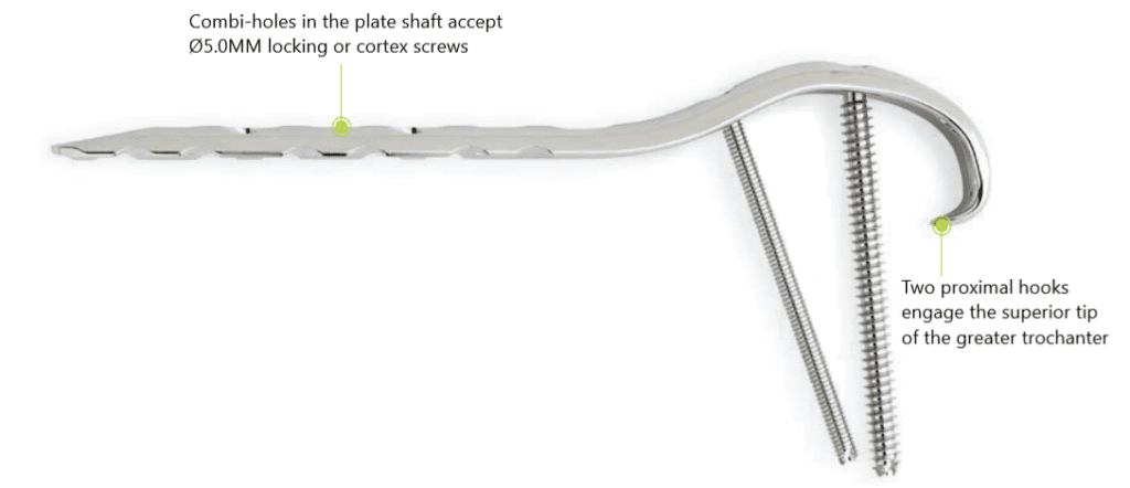 The LCP Proximal femur Hook plate is used in the treatment of fractures of the trochanteric region, trochanteric simple, trochanteriodiaphyseal, multifragmentray pertrochanteric and additional fracture of the medial cortex, metastatic fracture of the proximal femur and osteotomies of the proximal femur.